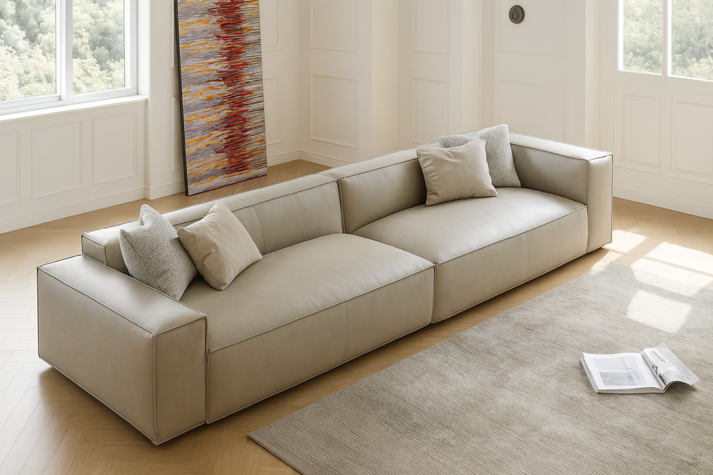 The Feri Sofa is crafted with luxurious Italian light grey leather that offers both style and comfort. Its sturdy wood frame ensures durability, while the spring coiled base provides exceptional support for a relaxing sit. Perfect for modern interiors, this sofa seamlessly blends elegance and functionality. Transform your home into a haven of sophistication with this exquisite piece.