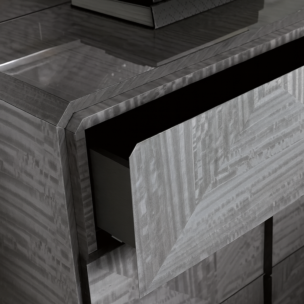 The dresser is finished in a polished grey veneer with a high-gloss lacquered surface, showcasing an intricate geometric pattern that highlights the natural grain of the wood. Each detail— from the sleek, linear handles to the seamless joinery—reflects exceptional craftsmanship and modern elegance.