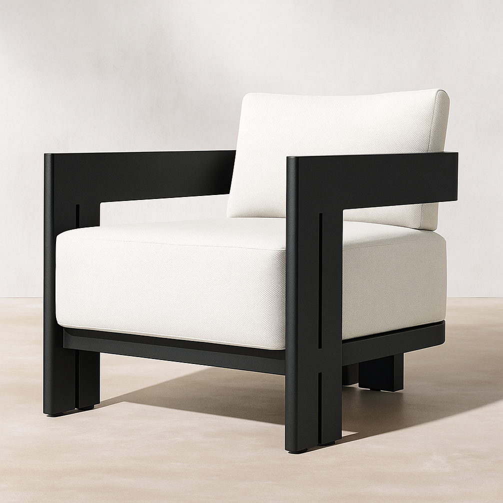 Built on durable aluminum frames with a matte powder-coated finish, each piece is engineered to endure the elements without compromising style. The bold, sculptural framing pairs beautifully with the soft curvature of the cushions, achieving a harmonious balance of strength and comfort.