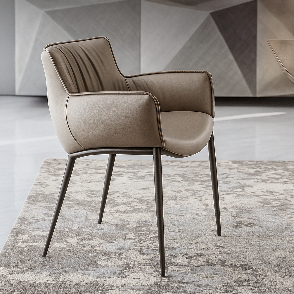 Upholstered in premium Italian light grey leather, the Positano offers a soft, supple feel and timeless tonal warmth. Its contoured back and gently curved arms provide ergonomic support, ensuring comfort during leisurely dinners and long conversations.